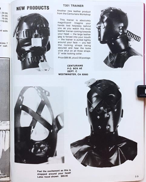 写真やイラストはかなりハードめなボンデージものです。センチュリアンは1978年にディシプリン・ヘルメットのカタログを刊行し、
